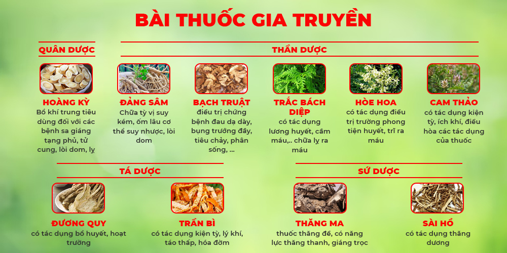 Dựa trên căn nguyên gây ra bệnh trĩ, bài thuốc Bổ Trung Ích Khí với các vị thuốc chính gồm Hoàng kỳ, Đẳng sâm, Thăng ma … cùng các vị thuốc chỉ huyết khác như: Ô tặc cốt, Trắc bách diệp, Hòe hoa, Cỏ nhọ nồi… giúp điều trị vào gốc bệnh trĩ gây xuất huyết, giải quyết nguyên nhân gây nên bệnh trĩ bằng cơ chế: