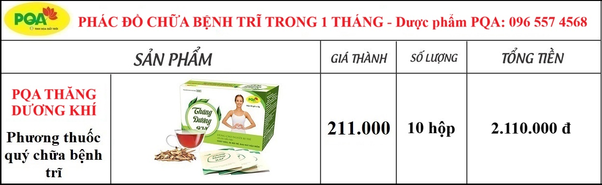 - Với tác dụng như vậy nên sản phẩm “Thăng dương khí PQA” cực kỳ hiệu nghiệm với bệnh trĩ hỗn hợp, trĩ nội, ngoại độ 1 và độ 2, 3. Nếu trĩ độ 4 thì vừa dùng các phương pháp khác làm rụng các bũi trĩ, đồng thời uống kèm bài thuốc này cho đến khi lành vết thương và phòng không bị tái phát trở lại.